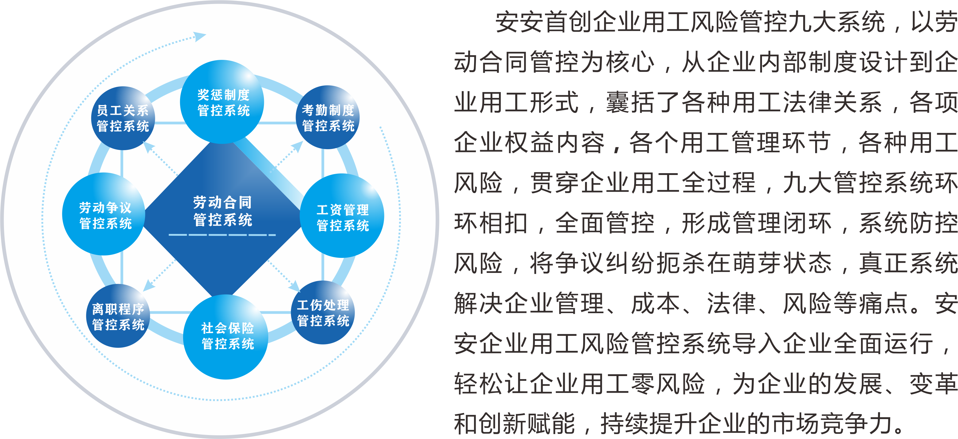 安安领先创建企业用工风险管控九大系统和九大系统工具包,拥有100多人的专业团队,30多位行业领域实战专家顾问老师、独特的咨询班课程与顾问咨询落地服务体系,提供用工风险九大管控系统与个性化的劳动法+咨询落地系统解决方案,系统解决企业人力资源管理过程中的员工关系问题,帮助企业有效降低人力成本,实现用工管理的优化升级,灵活零风险用工。